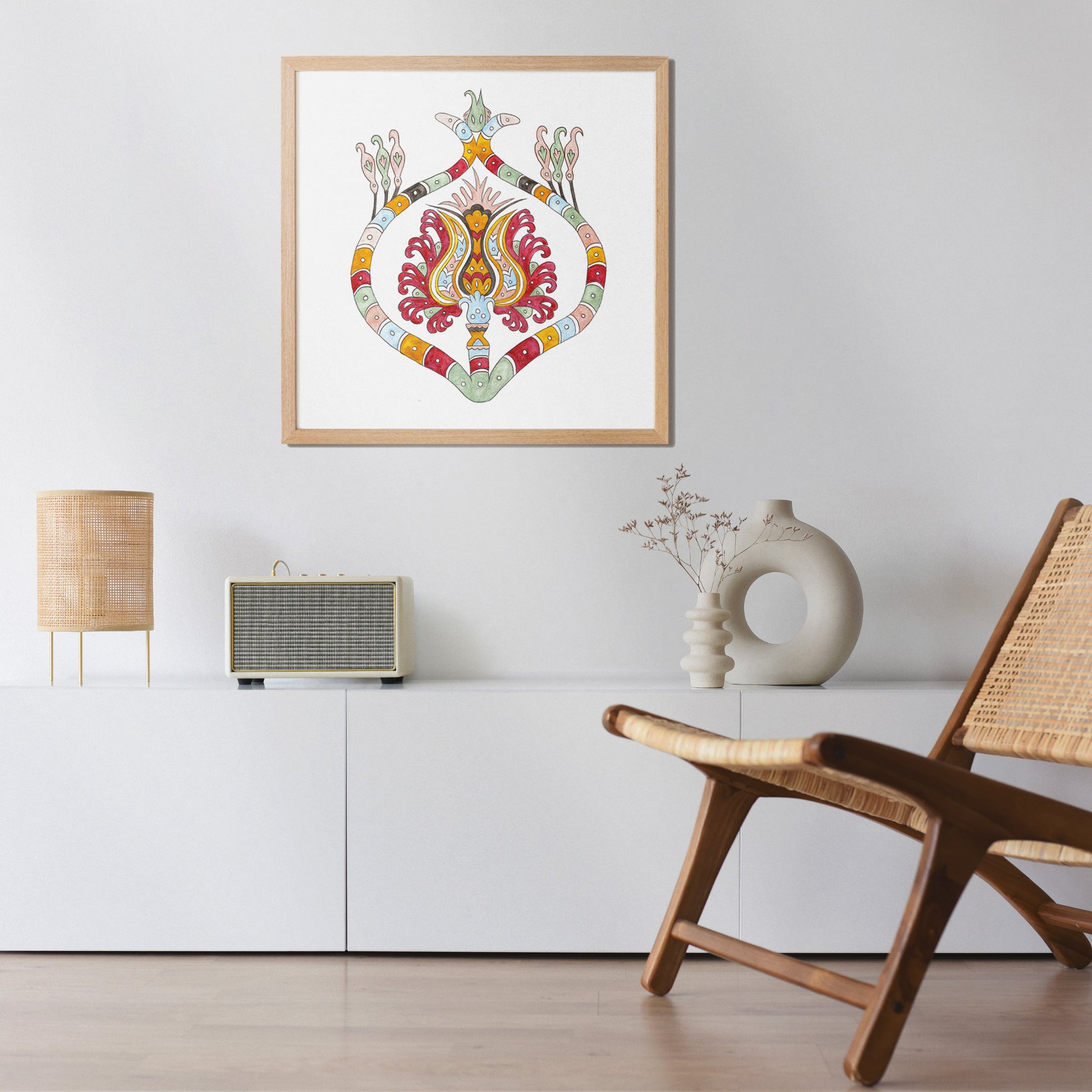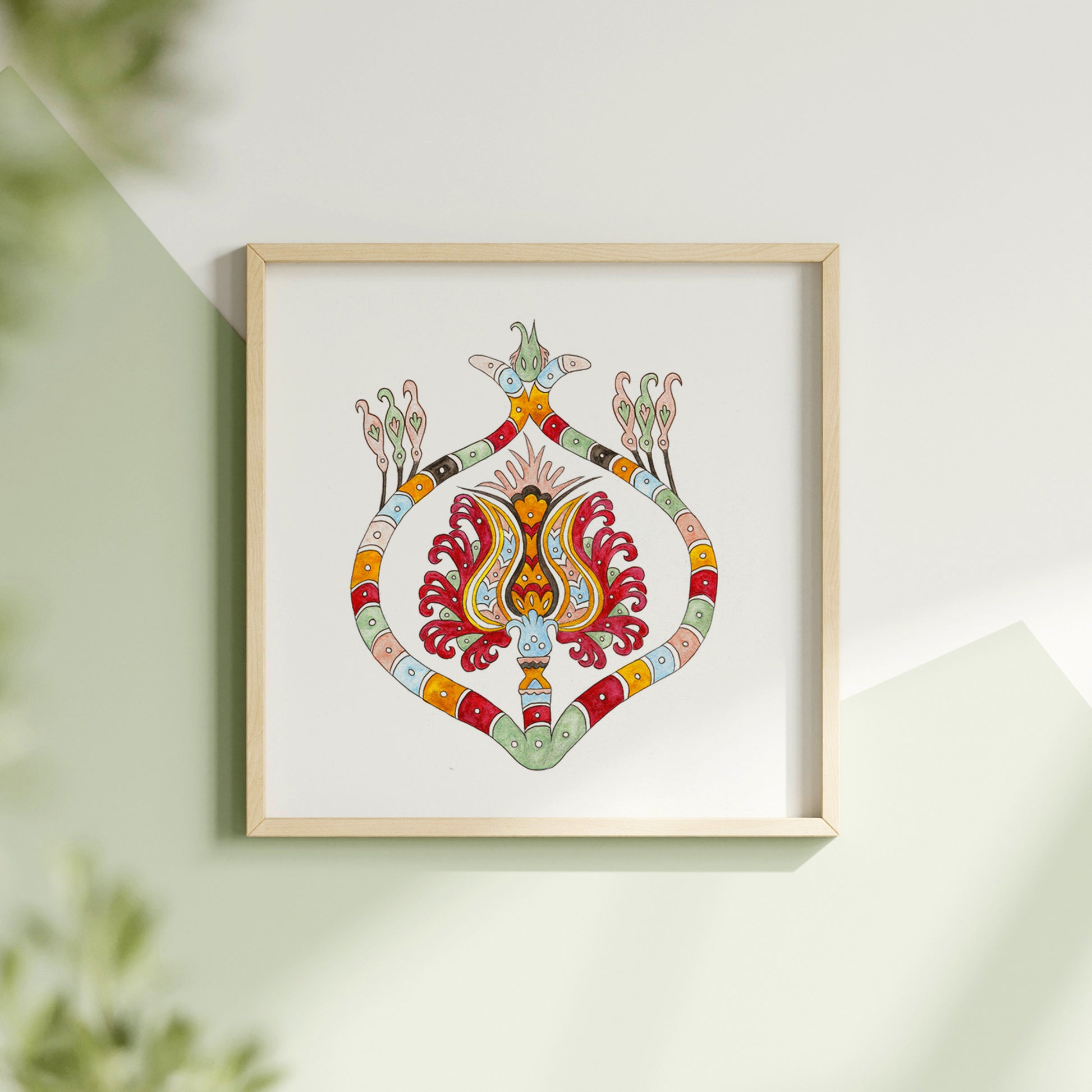 The Flower Engulfed in Snake art print is a unique design inspired by a piece of embroidery from the island of Skyros that was crafted in honor of the birth of Ariadne's daughter.